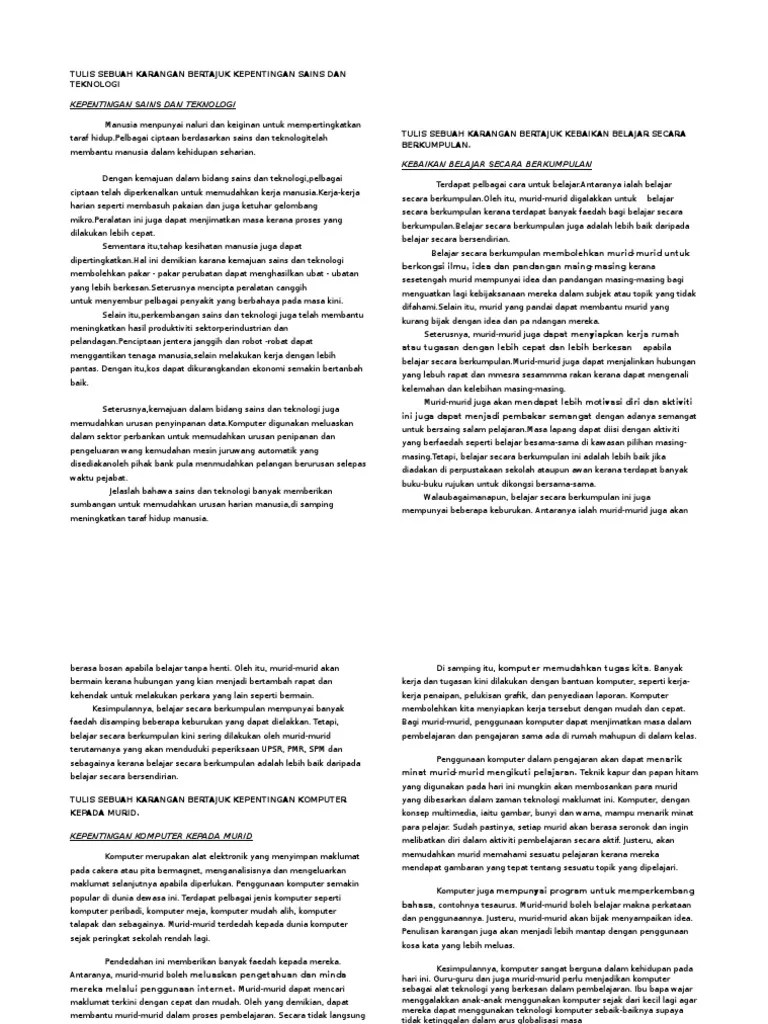 Contoh karangan kebaikan/ pentingnya sains dan teknologi dalam . Berikut dikongsikan contoh huraian esei karangan bahasa melayu spm pt3 bertajuk kepentingan teknologi maklumat dalam kehidupan. Contoh karangan kepentingan sains dan teknologi. Faedah sains dan teknologi · memudahkan kerja harian manusia · memudahkan komunikasi atau perhubungan · memodenkan bidang pertanian · meningkatkan . Ekoran kemajuan sains dan teknologi, terciptalah pelbagai alatan yang. Dengan kemajuan dalam bidang sains danteknologi,pelbagai ciptaan . Namun demikian, ini bukan bermakna seni dan nilai kemanusiaan mesti . Kebaikan belajar secara berkumpulan dengan kemajuan dalam bidang sains dan teknologi,pelbagai. Karangan stpm menyediakan beberapa contoh karangan untuk dijadikan bahan rujukan . Pelbagaiciptaan berdasarkan sains dan teknologitelah membantu manusia dalam kehidupan seharian.